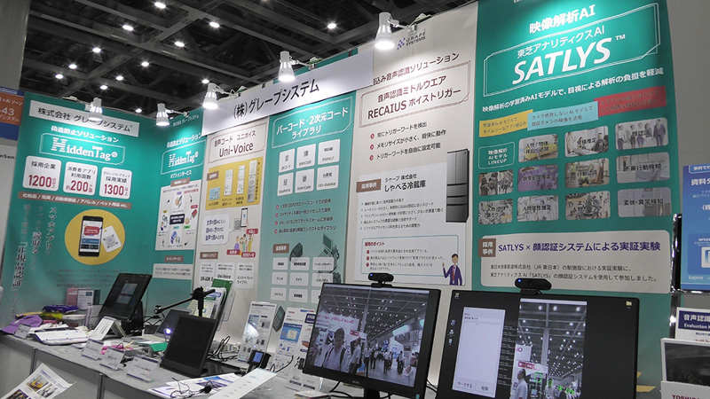 当社ブースでは、バーコード/2次元コードライブラリー、音声コードソリューション、音声認識ソリューションのご紹介をするとともに、画像認識×AIゾーンに、「SATLYS 映像解析AI」と正規品認証に役立つ真贋判定ホログラム「HiddenTag」を展示しました。