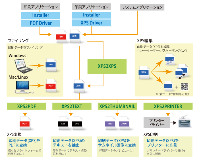 gXDFは印刷環境を問わず、XPSファイル出力やPDFファイル出力からXPSファイル変換や編集など様々な機能を実現します。