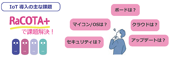 「RaCOTA+(ラコタプラス)」はグレープシステム社、ルネサスエレクトロニクス社、ユビキタスAI社、テセラ・テクノロジー社の4社のコラボレーションにより開発された評価/開発/量産で使用できるオールラウンドIoTプラットフォームです。
