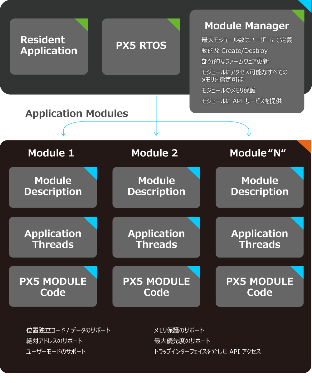 PX5 MODULES は、多くの組込みRTOSクラスのソリューションでは利用できない独自の軽量プロセスです。これにより、アプリケーションはテストがあまり行われていないソフトウェアコンポーネントを分離し、部分的なシステム更新を実行できます。